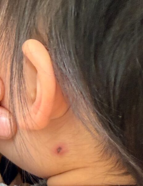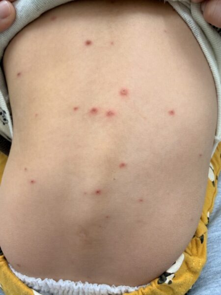 伝染性軟属腫の可能性も考えたが、丘疹の拡大があまりにも早すぎるため否定的と判断した(仮に伝染性軟属腫であったとしても周囲への影響も乏しく、重症化もしないため後回しで良いという背景もある)